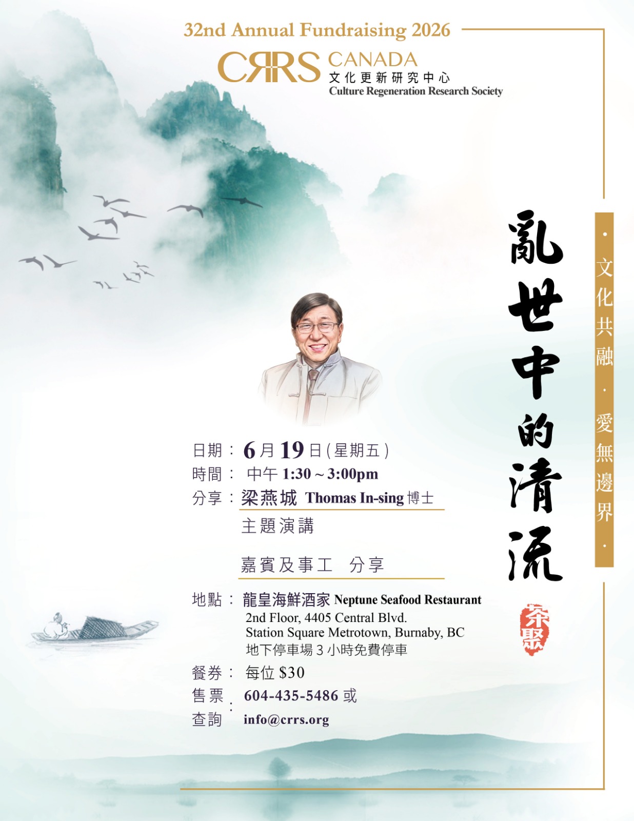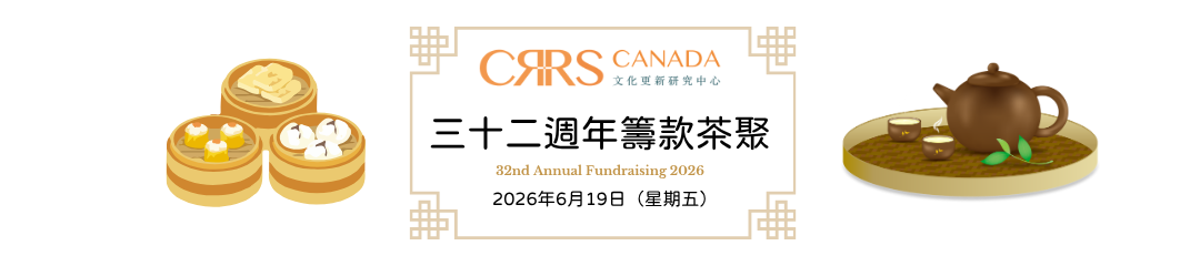文化更新研究中心三十二週年籌款活動將於 2026年6月19日 (星期五) 中午 1:30 至 3:00 本那比龍皇海鮮酒家舉行。本次活動將以小型午餐飲茶的形式進行,名額有限,餐券每位加幣三十元正。